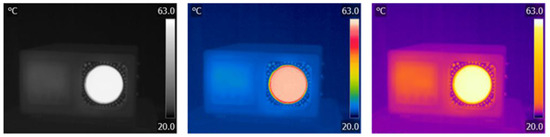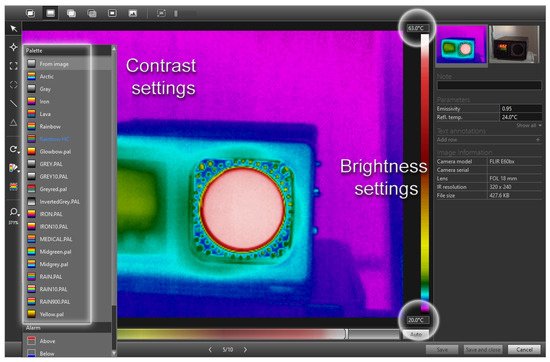 The basic operations that are performed on images in this contribution are brightness and contrast. However, these operations on the thermograph change the information that the thermograph initially gives. Figure 7 shows a dialog box of the support program (FLIR Tools—basic software that comes with FLIR infrared thermal camera E60bx) that is provided with each camera, and what would correspond to the set brightness in thermography in photo processing, corresponds to the minimum and maximum temperature settings, i.e., the temperature space of the analysis. In terms of contrast, we have palettes that highlight individual areas of the temperature distribution with different hues and advertise the observation of changes in thermal patterns.