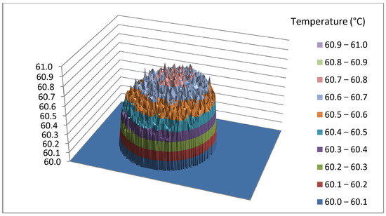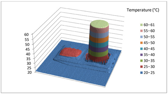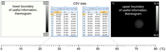 When searching for raw data in CSV format, extreme values can be defined by searching for the minimum and maximum values. As can be seen in the description, Figure 8 shows the area of useful information on the thermograph. As can be seen on the left part of the image, the information does not exist at temperatures below 20 C, and on the right part of the image it can be seen that the information disappears at temperatures above 60 C, which can be seen by looking at the reference surface of the blackbody, whose temperature is 60.805 C, in a barely perceptible way. The number of decimal places should not be interpreted as the precision of the measurement result, as it is a result of the statistical processing of AD, which includes the noise of semiconductor drift; for example, cameras that upscale thermal images have up to 12 decimal places.