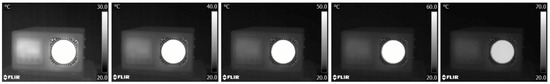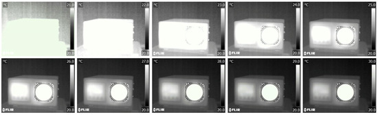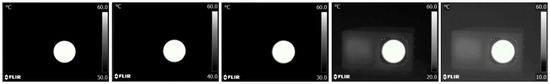 Increasing the temperature range by ten degrees Celsius from the lowest temperature decreases the brightness, but increases the amount of useful information in relation to the visual experience of recognizing certain shades that correspond to temperature differences (Figure 10). Although the amount of information on the thermograph decreases visually, it increases from a thermographic point of view until the maximum recorded temperature is exceeded.