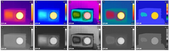 To summarize, from the above examples it can be deduced that in thermographic analysis, the most important parameter is to determine the minimum and maximum temperature in order to use the maximum dynamic range for information transfer. From a photographic point of view, the loss of information does not affect the visual impression, as can be best seen in the image in Figure 9, because the increase in the temperature range and the appearance of new information increases the contrast and recognizability of the analyzed object. On the other hand (Figure 10), the visual experience of the image changes significantly as the image goes into saturation due to the new information and becomes more difficult to recognize visually. Contrast in thermography is altered by the choice of color palette, as seen in Figure 12. To allow comparison, we transferred the thermographs from five different palettes (Iron, Artic, Rainbow HC, Lava, Medical) to BW images to show what the normalization of the histogram looks like when performed in the native thermogram, i.e., without color. The method is not well suited for practical use, because we can associate different temperatures in the image for certain shades, i.e., values, i.e., we lose information about temperatures.