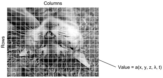The 2D continuous image is divided into N rows and M columns. The intersection of a row and a column is called a pixel. The value assigned to the integer coordinates with and is . In most cases, —which is considered as the physical signal incident on the face of a 2D sensor—is actually a function of many variables, including depth (z), color (), and time (t) [13].