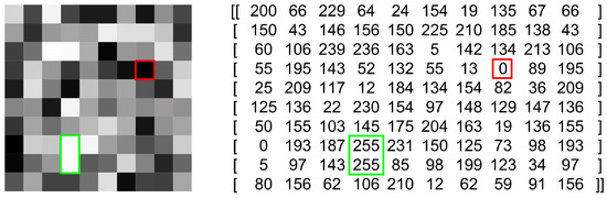 Quantization is the process by which the value of each pixel in the image is determined. First, a basic gray level, that is, the range of values that a pixel can have, is determined. Then, the value of the pixel in the digital image is calculated according to the value that comes from the continuous signal. If the gray level of an image is n bits, its gray level range has the value . For example, the range of values that pixels can take for a gray level of 3 bits is [0–7], while the range of values that pixels can take for a gray level of 8 bits is [0–255]. The values that one pixel has is called the intensity of a pixel [14]. A quantized image is shown in Figure 14, where the red square encompasses the value 0 (black color), while the white color is represented by the value 255 encompassed by a green rectangle. All other colors (gray values) are in the interval 0–255.