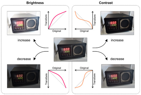 Brightness adjustment changes the overall brightness of an image, whereas contrast adjustment changes the difference in intensity between the light and dark areas of an image (Figure 15). The figure shows the non-linear transfer functions used to achieve the desired operations. Otherwise, they are standard image processing functions. Both adjustments can be used to improve the quality and visual appeal of an image, and to prepare it for further analysis or processing [15].