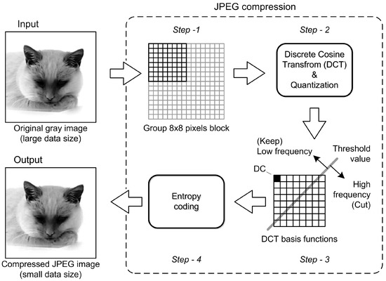 JPEG (Joint Photographic Experts Group) is a commonly used image compression standard, first introduced in 1992. The JPEG compression algorithm is based on the discrete cosine transform (DCT), a mathematical transformation that can efficiently convert an image into a frequency domain representation. The JPEG compression algorithm applies the DCT to the image, quantizes the resulting coefficients, and then encodes them using variable length coding [17].