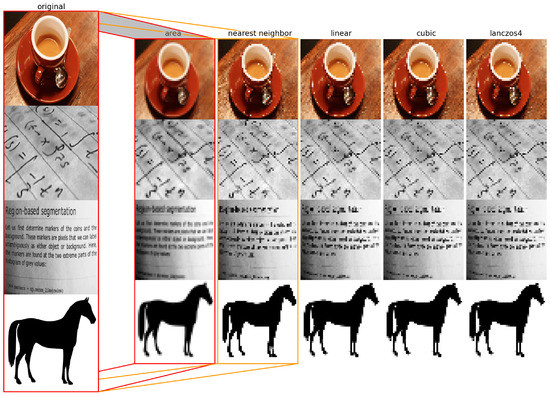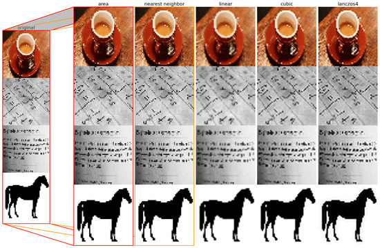 - Han, D. Comparison of commonly used image interpolation methods. In Proceedings of the Conference of the 2nd International Conference on Computer Science and Electronics Engineering (ICCSEE 2013), Hangzhou, China, 22–23 March 2013; pp. 1556–1559. [Google Scholar]