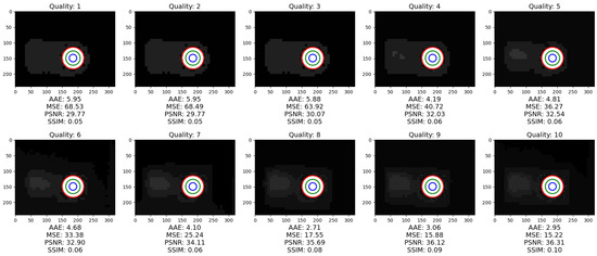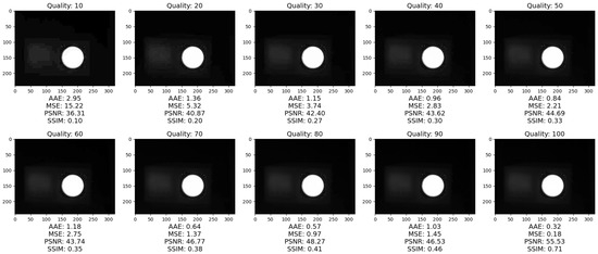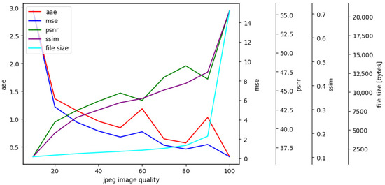 Increasing the JPEG quality parameter generally improves the quality of the compressed image. The AAE and MSE decrease with an increase in the JPEG quality parameter, while PSNR and SSIM increase, as higher quality JPEG images have less artifacts and distortions and retain more details from the original image. However, it should be mentioned that increasing the JPEG quality parameter beyond a certain point does not significantly improve image quality, but instead increases file size. Therefore, a balance between image quality and file size when selecting the optimal JPEG quality parameter should be achieved.