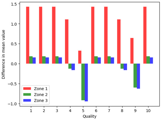 The median values in Table 5 are equal, but the mean values change with the diameter of the circle. For the best results, the following experiments use the ROI, defined by the blue circle (Zone 3) in Figure 25. Since the experiments previously shown in Figure 24 did not show much degradation, a higher compression ratio was used to test the hypothesis that the temperature value of the ROI changes with different compression ratios. The results are shown in Figure 28. All zones are depicted and the AAE, MSE, PSNR, SSIM are calculated. Since the ROIs cover a small range with mostly the same values, the results are similar.