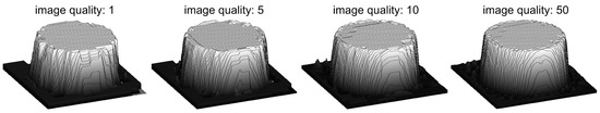 To investigate the effects of image manipulation on thermographic images, we used a blackbody as a reference and defined three ROIs at different radii around the blackbody. We then varied the JPEG quality parameters to compress the images and evaluated the effects on the temperature values in the ROIs. It was found that decreasing the JPEG quality parameter resulted in decreased image quality and vice versa but only up to a certain point (75–80 image quality index), where further increasing the quality parameter did not significantly improve image quality. This is consistent with previous studies that have shown a trade-off between file size and image quality with JPEG compression [26]. Interestingly, we found that the mean and median temperature values of the ROIs were not significantly affected by the decrease in JPEG quality, except for the largest ROI, where the mean temperature value decreased slightly at higher compression rates. This suggests that JPEG compression can be applied to thermographic images without significantly affecting temperature values in specific ROIs.