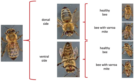 When evaluating different approaches to detect parasites in bees, we considered re-splitting the database to obtain four classes of 500 images each. The new sets respect the original labels of the database through a manual classification separating the images into four categories: bee dorsal side healthy, bee dorsal side with Varroa, bee ventral side healthy, and bee ventral side with Varroa.