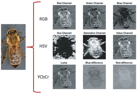 Furthermore, the difference between the classification results with YCbCr and RGB spaces is that the former represents color as brightness and two color difference signals. In contrast, the latter represents red, green, and blue colors. The color composition in the primary colors limits the classification of the Varroa. In HSV color space, it is separated by hue, saturation, and brightness, so it performs better than in RGB space. The tone component must highlight the Varroa, unlike the Cr of the YCbCr space.