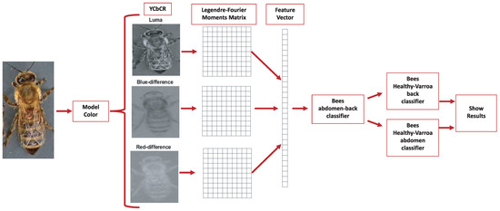 The proposal evaluates the performance of the descriptors in different color models to carry out the subclassification process. In the first stage, the features of the Legendre–Fourier moments are extracted for each channel of the selected color model. Figure 3 shows an example of the color models used and their respective channels. The descriptors are obtained to enter the first classifier to detect the bee’s orientation (dorsal side or ventral side). According to the output received, the second classifier identifies the presence of the Varroa mite. Figure 4 shows the proposed classification process for the YCbCr model.