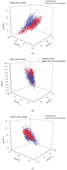 The results show a particular advantage with multichannel moments and the YCbCr color space over other color spaces and deep learning algorithms. The Varroa color group is more compact in YCbCr than in different color spaces. Furthermore, it has a minor overlap between the Varroa and honeybee data under various lighting conditions. The Y denotes the luminance component, and Cb and Cr represent the chrominance factors. Mainly, the Cr component highlights the characteristic red color of Varroa, thus facilitating the classification.