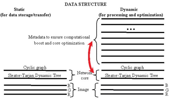 The use of the exact Formula (2) for and the elimination of intermediate calculation of the pixel cluster centers increases the efficiency of minimizing the error E without affecting the speed of computer calculations. Computing in terms of Sleator–Tarjan Dynamic trees unsurpassedly increases the speed and reduces the computer memory consumption, especially when using the proper data structure, which is discussed in the next two sections.