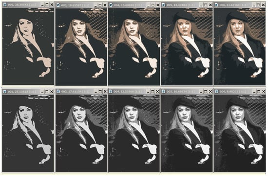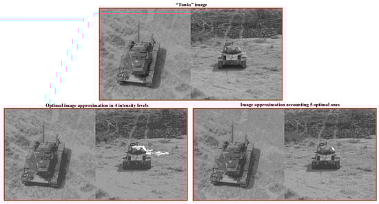 The “Tanks” image optimal approximations of pixels and “Girl” grayscale optimal approximations of pixels were obtained as in [20]. The optimal approximations of the “Girl” color image and “5images” color picture of pixels were obtained by many iterations of Ward’s method, using different initial values of enlarged pixel count, with further selection of approximations having the lowest values of error E for each color number, ranging from 1 to 100. For this purpose, Ward’s method was run by two versions of the software implementation, with the number of enlarged pixels in the range from 100,000 to 154,401 for the “Girl” color image and with in the range from 560,000 to 796,092 for the “5images” color picture.