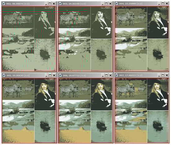 Figure 10 shows the optimal approximations in two to seven colors for the -pixel “5images” picture (compare the optimal approximations for the -pixel “Girl” image, given in Figure 8 with the optimal approximations of the same image embedded into the “5images” picture in Figure 10). The observed stability effect can be, to some extent, explained as follows: optimal pixel clustering is achieved via image merging, both in the case of merging identical images and when merging such images, where the average intensities turn out to be quite disparate, although the intensity ranges may overlap.