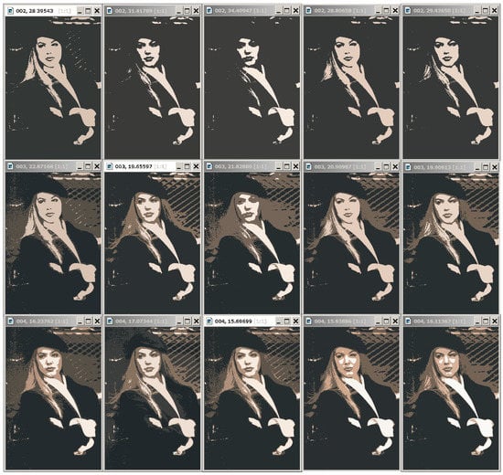 Dynamic Table of approximations for “Girl” color image (dimensions pixels). The first row and first column of the table were cropped. The columns of Dynamic Table, containing the optimal image approximations in 2–6 colors, are shown. Each column contains a binary hierarchical sequence of image approximations with incrementally added colors: , and 4. On the main diagonal of the Dynamic Table are the optimal image approximations in , and 4 colors. Image approximations at the top are labeled with g color numbers and corresponding standard deviation values .