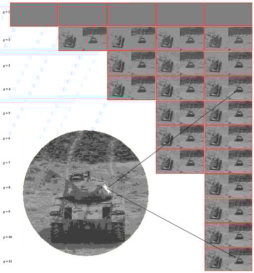Dynamic Superpixel Table for the grayscale “Tanks” image (dimensions pixels). The columns contain binary hierarchical sequences of approximations in the incremental number of intensity levels from to , indicated on the left. The lowest approximations in each column are the superpixel approximations obtained as intersections of the optimal image approximations. The other approximations are generated from the latter using Ward’s pixel clustering. A problematic five-pointed star (filled with white) appears at approximations in intensity levels 4–11.