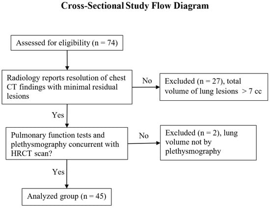 We performed a retrospective cross-sectional study of participants enrolled in the clinical study “Cardiopulmonary inflammation and multi-system imaging during the clinical course of COVID-19 infection in asymptomatic and symptomatic persons” (clinicaltrials.gov NCT04401449) from December 2020 to April 2022 at the Clinical Center of the National Institutes of Health, USA. The study was approved by the National Institutes of Health IRB (IRB # 20CC0113). The participant inclusion criteria for this study were as follows: 1) adult patients who were enrolled in the clinical trial cited above; 2) those who underwent pulmonary function and plethysmography lung volume tests concurrent with a non-contrast HRCT chest scan in the recovery and/or convalescent phases of the disease from 4 weeks to a year after the onset of symptoms; and 3) radiology reports described the resolution of chest CT findings with zero or minimal residual lesions remaining, with the total volume of lesions less than 7 cc. The flow chart for study inclusion is illustrated in Figure 1.