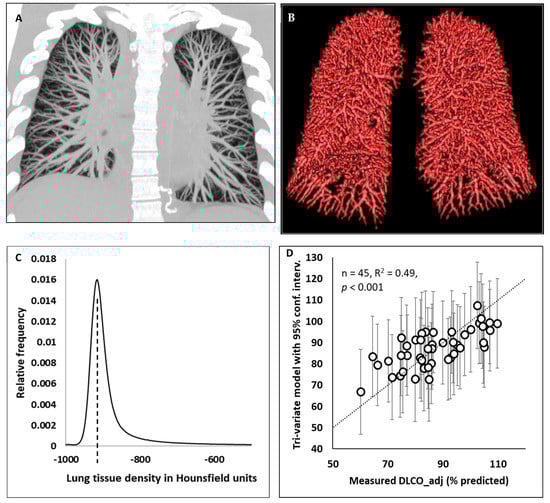 Illustrations of computed tomographic measurements and a tri-variate model of the diffusion capacity of the lung. (A) Maximum intensity projection of an HRCT scan of a post-COVID-19 patient, highlighting intraparenchymal arteries and veins. (B) The 3D structure of pulmonary blood vessels that were segmented from the HRCT images. (C) A histogram of the lung tissue radiodensity values of a patient in Hounsfield units. The mode (peak) of the histogram is marked by the dashed line. It represents the typical radiodensity of non-vessel parenchymal tissue. (D) The measured values of the DLCO_adj (% predicted) versus a tri-variate model combining the three variables that were statistically significantly associated with the DLCO_adj (% predicted). Error bars represent the 95% confidence intervals of the model values. The three variables are the alveolar volume (% predicted), blood vessel volume fraction, determined via CT, and the mode of the parenchymal radiodensity histogram, also determined via CT. The dotted line is the identity line.