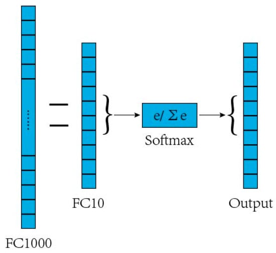 Due to limited images in the dataset, the CNN may suffer from overfitting by training from scratch. Therefore, it is necessary to use the transfer learning to pre-train the CNN by using part of the sample image data of the known classes (training set). The backbone model used for transfer learning is a CNN pre-trained on the ImageNet dataset. The three newly added layers (full connection layer FC10, SoftMax layer, and output layer) of the ten known tree leaf classifiers trained with ResNet50 as the trunk network are appended behind the ResNet50’s full connection layer FC1000, where the two horizontal lines represent a full connection as is shown in Figure 2. FC1000 is a feature vector with a dimension of 1 × 1000 formed by integrating features extracted from the ResNet50 network. This feature vector is the image feature obtained by the trained CNN. After the CNN is trained, partial samples of known classes and all samples of unknown classes (test set) are fed into the network, and the output features of FC1000 are used as the input for subsequent open-set recognition. In this section, CNN trained by transfer learning mechanism is used for feature extraction.