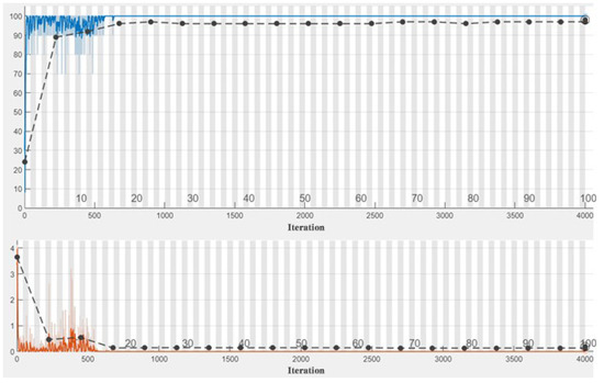 In the experiment, we used ResNet50 as the backbone network and weighted SVDD as the open-set recognition algorithm. We used the network search method [28] to obtain the optimal gamma of 0.5 and cost of 7.5. In the transfer learning process, the Resnet50 network from the Matlab Deep Learning Toolbox is used as the transfer network and the original network output layer is replaced by the new layer which is shown in Figure 2. The CNN was trained with 100 epochs. The Adam optimization algorithm [29] was used with initial learning rate 1 and the train result of Case 2 is shown in Figure 4. At present, deep learning algorithm has been used in wood species classification and has achieved good recognition effect [13,14,30]. Therefore, the experimental comparison in this paper includes both traditional machine learning classification method and advanced wood species classification algorithm. Local binary pattern (LBP) [31], histograms of oriented gradients (HOG) [32], SVM [17], ResNet50 [33], Vgg16 [34], GoogleNet [35], and SqueezeNet [36] were used for comparison.