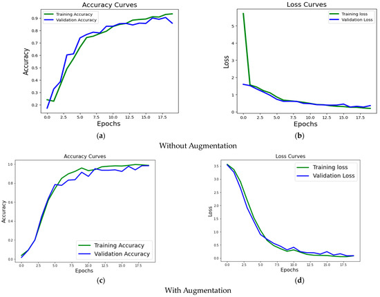 Accuracy and loss evaluation of the proposed methodology over the LivDet dataset without augmentation are given in subfigures (a,b). The same metrics are graphically depicted in subfigures (c,d) for the experiments with augmentation.