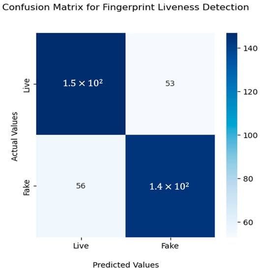 Confusion matrix for fingerprint liveness detection using Resnet50 with sequential attention model.