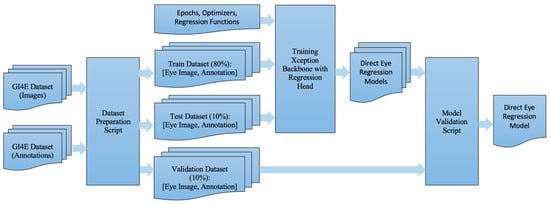 Figure 2 presents a comprehensive overview of the steps required to create the final direct eye regression model. This model is trained using the GI4E dataset, which incorporates annotation data. To facilitate the generation of essential datasets (training, testing, and validation), a dedicated Python script (version 3.9.2) was developed, allocating data in an 80:10:10 ratio. The first two datasets were employed for training and evaluating the Xception backbone with a regression head. Multiple models were generated, exploring various combinations of epochs, optimizers, and regression functions. The selection of the optimal direct eye regression model was determined through validation using the validation dataset. Our custom Python script calculated the mean squared error (MSE) against the ground truth, ultimately identifying the model with the lowest MSE as the final direct eye regression model.