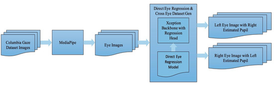 The process of creating the cross-eye regression model commences with the preparation of cross-eye datasets, specifically the left eye image alongside the estimated location of the right pupil. These steps are elucidated in Figure 3. The Columbia Gaze Dataset serves as the source, and MediaPipe is harnessed to extract regions of both eyes. Only eyes with approximately equal sizes, falling within a size difference range of 0.90 to 1.10, are deemed acceptable. This criterion ensures that the cross-eye pupil location remains within a similar scale as the eye image. Subsequently, the direct eye regression model is applied to these eye regions to estimate pupil locations. It is important to note that for each image containing a pair of detected eyes, this step yields two distinct outputs: (1) the left eye image alongside the estimated location of the right pupil (resulting from applying the direct eye regression model to the right eye image), and (2) the right eye image alongside the estimated location of the left pupil.