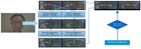 Figure 4 provides an overview of our strabismus detection methodology. The process begins with input eye region bounding boxes obtained from MediaPipe (https://pypi.org/project/mediapipe/, accessed on 27 October 2024). To ensure consistency, the bounding boxes for both eyes are required to have comparable sizes within a permissible range of 0.9 to 1.1. The following steps are then applied to the input eyes.