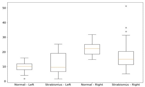 In Figure 5, we present the box plot results obtained from our extensive statistical analysis of the dataset. These box plots offer valuable insights into the distribution of Euclidean distances for both left and right eyes among individuals with normal vision and those affected by strabismus. Notably, the box plots reveal distinct patterns in the data distribution. For the left eye, the box plot illustrates that the median Euclidean distance for individuals with strabismus is noticeably lower than that of individuals with normal vision, while exhibiting a wider interquartile range. Conversely, the right eye’s box plot showcases a higher median Euclidean distance for individuals with normal vision, along with a more concentrated distribution, in contrast to individuals with strabismus. These findings suggest that it is indeed possible to establish effective separation criteria between normal and strabismus cases based on the mean and standard deviation of Euclidean distances, as indicated by the thresholds Θleft and Θright.
