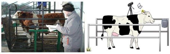 Estimating the weight of cattle is essential for sustainable beef production and cattle breeding since it helps the farmer track the growth of the cattle, []. Precise weight estimation plays a crucial role in well-informed decision-making [] regarding slaughtering, safeguarding the welfare of cattle [], and maximizing beef production. Weight estimation has historically been done using manual methods [] (as shown on the left side of Figure 1) that do not have the accuracy needed for contemporary farming techniques []. Manual methods are time-consuming and stressful because the cattle are physically handled and fixated. Thus, they are not good for cattle welfare. The shortcomings of these manual techniques highlight the need for an automated process that embraces the cutting-edge capabilities provided by cutting-edge technologies [], especially in the areas of artificial intelligence and machine learning [] (as shown on the right side of Figure 1).