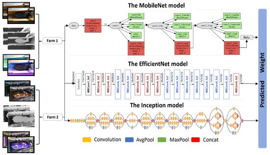 The MobileNet model (MOB), the EfficientNet B1 model (EFF), and the Inception model (INC). The data in different modalities are fed to each model individually, which predict cattle weight after the training process.