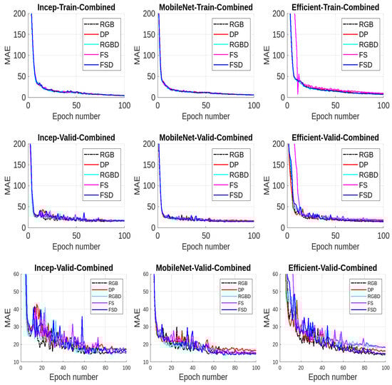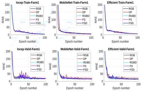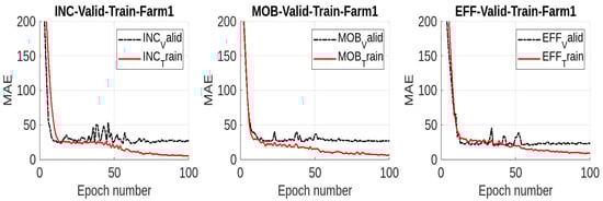 Results for the only-cattle region from RGB images from Farm1 using MAE: training and validation results using mean absolute error (MAE) for all three models.