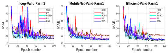 We present the results for all the five data modalities for Farm 1 in Figure 7, considering the three models INC, MOB, and EFF. In this analysis, three deep learning models, INC, MOB, and EFF, are evaluated across five distinct data modalities to assess their performance in cattle weight estimation. Through this analysis across the RGB, DP, RGBD, FS, and FSD modalities, we aim to uncover how each model adapts to and leverages diverse data characteristics for accurate cattle weight estimation. The INC and MOB models present good performances considering the MAE performance metric. However, the EFF model, characterized by uniform scaling of depth, width, and resolution, offers a scalable architecture for addressing different complexities in these data modalities and has even better performance than INC and MOB. The model shows stable output considering the RGB, RGBD, and FSD modalities. In Figure 8, we present the results for all five data modalities for Farm 2, considering the three models INC, MOB, and EFF. Furthermore, in this case, we evaluate these models across these data modalities to analyze their performances using the MAE metric. As can be seen, the situation remains the same as with Farm 1. Again, the EFF model presents better results considering these data modalities. Furthermore, in Figure 9, we present the results for all five data modalities by combining data from both Farm 1 and Farm 2. In this analysis encompassing the RGB, DP, RGBD, FS, and FSD modalities, our primary objective is to elucidate how each model adapts to and harnesses diverse data characteristics for precise cattle weight estimation. Notably, all three models demonstrate commendable performance levels. The robustness of their performance across varied data modalities positions these models as promising candidates for accurate and reliable cattle weight predictions. As can be seen, the variations in the MAE score are not very pronounced in the case of the EFF model.