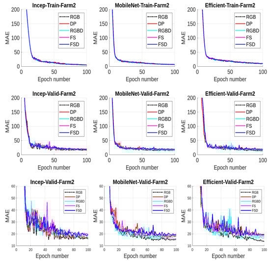 We present the results for considering the only-cattle region from RGB images from Farm 1 in Figure 6. The results are shown for all the three models INC, MOB, and EFF. As can be seen, all the models become overfitted by considering only the cattle region. We also report the performances of three deep learning models using the performance metrics mean absolute error (MAE), root mean squared error (RMSE), mean absolute percentage error (MAPE), and R-squared () in Table 1. The values for these metrics are unsatisfactory for all the models, representing poor performances. In fact, the region-specific analysis related to cattle does not capture the comprehensive features necessary for accurate weight prediction. Additionally, the context of the surrounding environment helps models better encode the features related to weight estimation. Therefore, the analysis results in a limited and biased representation of the data by overlooking these contextual cues. Based on this analysis, we will not use the only-cattle region for further analysis. The focus of the analysis will instead be on the five data modalities we mentioned earlier.