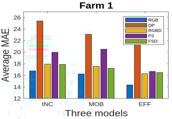 Moreover, in Table 4, we present the results for the combined data from Farm 1 and Farm 2. Here, the compelling analysis of cattle weight estimation across diverse data modalities brings forth noteworthy findings. The MAE metric results unequivocally highlight the superior predictive accuracy of the RGB, RGBD, and FSD modalities, showcasing their consistent ability to yield minimal absolute differences between predicted and actual weights. This resilience is further underscored by the results for the RMSE metric, reaffirming the robust nature of these modalities across all three models. Delving into proportional accuracy, the MAPE metric results accentuate the precision upheld by the models, demonstrating their adeptness at maintaining accuracy irrespective of varying weight scales. Moreover, the () metric results offer a profound insight into the capability of the modalities to elucidate the variance in cattle weights, pinpointing those that effectively capture the intricate dataset variability. We also report the results of three models using MAE in Figure 12. This also shows that RGB, RGBD, and FSD represent good accuracies. This holistic approach to performance evaluation has enabled a detailed understanding of the inherent characteristics of each data modality.