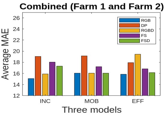 Combined data (Farm 1 and Farm 2): average MAE for three deep learning models using five different data modalities.