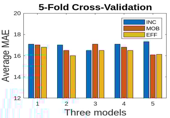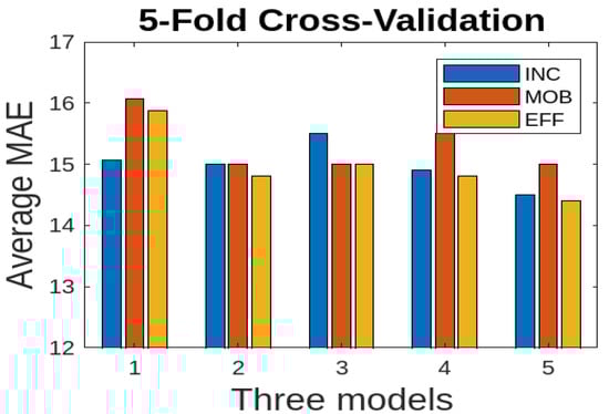 We also consider 5-fold cross-validation where the dataset is partitioned into five folds, ensuring an equal distribution of samples across folds. We used the average MAE to report the results for three deep learning models. We consider only RGB and FSD data modalities for the combined data (Farm 1 and Farm 2) since they show good results. The results are presented in Figure 13 for only the RGB data modality. The EFF model performs better comparatively; however, there are no significant variations across different folds. For 5-fold cross validation, we also consider the FSD data modality for the combined data (Farm 1 and Farm 2). The results are presented in Figure 14. Here, the EFF model performs better comparatively; however, there are no significant variations across different folds.