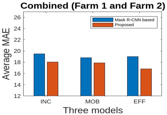 We also perform a comparison with a recent method [] based on Mask R-CNN. We created fully segmented images (FS) with the compared method []. We used only combined data (Farm 1 and Farm 2) for the purpose of comparison. We then used the three deep learning models for cattle weight estimation using the FS modality of the compared method [], and then our explored method []. The results are presented in Figure 15. As can be seen, the performance of our explored method [] is better in all the three cases.