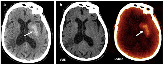 Conventional CT imaging systems use an X-ray beam that includes a wide range of photon energies (polychromatic or polyenergetic) to record the radiation attenuated by the different densities of tissues, expressed in terms of Hounsfield units (HU). CT systems measure the linear absorption coefficients of different tissues an X-ray beam passes through. The linear absorption coefficient is a result of the combination of two physical interactions of X-ray photons in the matter: photoelectric absorption (which is predominant under low energy and strongly depends on Z) and Compton scattering (CS) (which is predominant under high energy and depends on the electron density [ρ] of the material). However, single-energy CT systems show an inherent limitation in soft tissue differentiation. In conventional CT, the HU value (or CT number) of a voxel entirely depends on the linear attenuation coefficient (μ), a parameter that describes the fraction of attenuated incident photons in a monoenergetic beam per unit thickness of a material, which has considerable overlap between different body materials. If two different materials show similar coefficients (hemorrhage and iodine, for example), the same HU value will be assigned to both materials, and differentiating them will be difficult [1,5,6,7,8] (Figure 1).