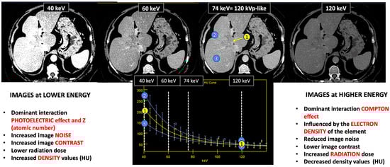 Polychromatic X-ray beams are composed of photons at many energy levels that form the X-ray spectrum. Due to this material-specific information of DECT, the density of each voxel can be extrapolated to a certain energy level to generate virtual monochromatic (VMI) series. These can simulate how CT images would look if a monochromatic beam of X-rays at a chosen single energy was used for imaging. This type of image may improve image quality, increasing the contrast–noise ratio and reducing artifacts (such as beam hardening at higher keV values). When using lower energy levels, the energy level can be shifted close to the k-edge of iodine (36 keV), which may improve the visualization of contrast-enhanced lesions and reduce the iodine contrast dose administered. This feature can be useful in patients with impaired renal function [1,2,3,4,5,6,7,8] (Table 2).