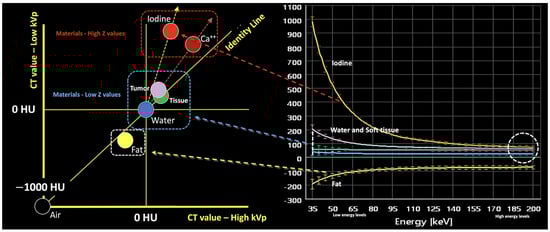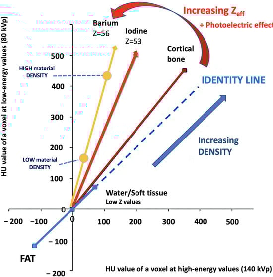 Materials with a high atomic number, such as iodine, calcium, barium, and gadolinium, are susceptible to the PE at lower energy levels, which can be exploited to differentiate those materials. On the contrary, lighter atoms, such as most atoms in soft tissues and water, do not present much of a PE in the range of energies used in clinical CT scans. Based on the relatively specific change in attenuation with two different energies, material composition information can be obtained to allow tissue characterization [1,2,3,4,5,6,7,8,9]. In this setting, two materials may have similar attenuation coefficients in the single-energy spectrum, but may be differentiated in DECT based on their attenuation properties at two different energies (Figure 1). When CT numbers of a material at low (70–80 kVp) and high (135–140 kVp) energies are plotted along y- and x-axes, the slope is a characteristic of the material, and the location of the value of a given pixel along this slope depends on density. The higher the Zeff value (iodine, calcium, barium), the steeper the slope (marked increase in HU values at low energy values). On the contrary, CT numbers of water and soft tissues (which have similar lower Zeff values) are not energy dependent and will change very little when varying the X-ray beam energy. Therefore, these elements will remain close to the identity line (or line of equality) that represents values at which both CT numbers are same. As a result, DECT may differentiate materials if their atomic numbers differ sufficiently. Furthermore, by consensus, water and air densities are 0 and −1000 HU, respectively, at all kVp, and thus lie on the identity line [9,10,11] (Figure 3 and Figure 4).