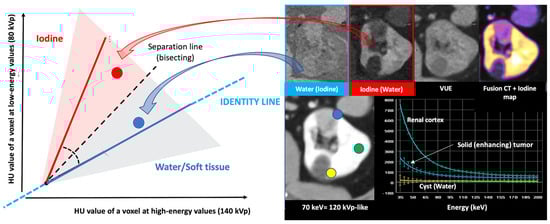 In material differentiation or labeling, two materials with different dual-energy slopes caused by different PE effects can be differentiated. Materials with high Z values (such as iodine, calcium, or barium) can be adequately differentiated from usual body materials (hydrogen, carbon, nitrogen, and oxygen), which present a weak PE at low energy values. This is fundamental to material decomposition using DECT. The characteristics of several basic materials like iodine, water, calcium, and fat at different energy levels are well known and used for analysis. Therefore, it is possible to characterize an unknown material based on its attenuation plot at different energy levels and according to its position in relation to these basic materials [5,6,7,8,9,10,11,12,13]. Decomposition algorithms create material-specific image pairs. Any two materials can be selected for two-material DECT decomposition, with iodine–water being the most useful (Figure 5). Nevertheless, the approach of basis material decomposition differs slightly, depending on the CT system used to acquire the dual-energy data.