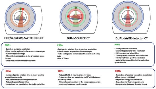The differences in hardware and software configurations across various DECT systems influence technical features, such as temporal resolution, coverage, and dose reduction, and impact spectral separation, material decomposition and quantification, and the types of images that can be generated. However, there is no perfect system and each has its advantages and disadvantages in clinical practice that are summarized in Figure 6 [4,6,7,8,9,10].