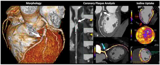 DECT may offer a “one-stop-shop” imaging approach in various organs such as the heart and liver. In the case of cardiac imaging, dual-energy cardiac CT allows for a global cardiac assessment combining morphologic and functional analysis. DECT imaging offers high spatial resolution cardiac morphology; coronary plaque imaging and analysis with calcium scoring (including in post-contrast scans) and subtraction of calcium; improved evaluation of stent patency; calculation of fractional flow reserve; dynamic myocardial CT perfusion; assessment of myocardial extracellular space; and calculation of DECT-derived parameters such as iodine contrast uptake [24,25,26] (Figure 8). Furthermore, DECT improves image quality and can reduce both radiation and contrast media administration. The generation of iodine perfusion maps is clearly one of the most attractive contributions of cardiac DECT imaging. These maps can outline the iodine distribution within the myocardium, improving the evaluation of perfusion defects in infarct and ischemia. However, it is necessary to emphasize that iodine maps assess myocardial blood volume at a given time, and that they are not multiphase acquisitions such as dynamic perfusion CT [24,25,26].