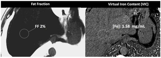 Another field of growing interest for the use of DECT is liver imaging. Advanced applications of liver DECT imaging include the assessment of fat and iron deposits and the calculation of the extracellular volume (ECV) (which is related to the degree of liver fibrosis). Although a non-contrast scan is preferred, recent studies have shown that DECT can accurately quantify liver fat even on contrast-enhanced images. In the case of liver iron content, both the attenuation difference of the liver between the low- and high-energy CT images or using an iron- or fat-specific material decomposition algorithm correlate well with the MR-based assessment of iron or fat accumulation [27,28,29,30] (Figure 9). The major limitations of the routine use of DECT in diffuse liver diseases are radiation and the additional software required for postprocessing. Finally, although DECT cannot directly detect or quantify fibrosis in the liver, the degree of hepatic fibrosis is strongly correlated with the ECV. The quantification of the ECV at a contrast-enhanced delayed phase (4–5 min) can be used to estimate the degree of hepatic fibrosis. A normalized iodine concentration of the liver (representing the ratio of the iodine concentration of the liver compared to that of the aorta) may reflect the amount of fibrosis based on the extent of iodine uptake [31].