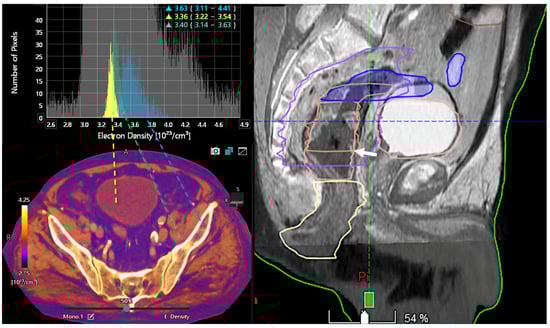 Color-coded electron density map based on DECT (bottom, left). Histogram analysis of electron density values at different locations (bladder lumen [water, yellow], muscle [green], and bone [blue]). Information on electron density is important for radiotherapy treatment planning in order to optimize the dose distribution and volume delineations. Sagittal fused CT and MR image (50% transparency) for therapy planning demonstrates the tumor (white arrow, right image).