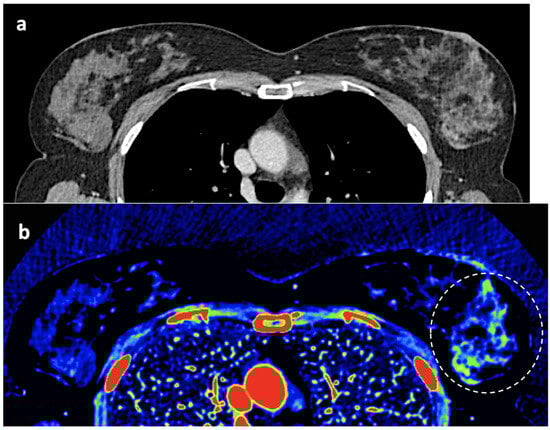 Figure 12. Breast 120 kVp-like (a) and color-coded iodine map (b) images. Breast lesion detection. Multicentric left breast invasive ductal carcinoma can easily be detected based on iodine uptake (dotted circle) compared to the 120 kVp-like image, where the diagnosis is challenging. - Currently, there is not a widely reported use of DECT in clinical management of prostate cancer. However, DECT imaging may facilitate the depiction of focal areas of increased enhancement in the periphery of the prostate in contrast-enhanced CT that may represent a clinically significant cancer and deserve further workup [42] (Figure 13).