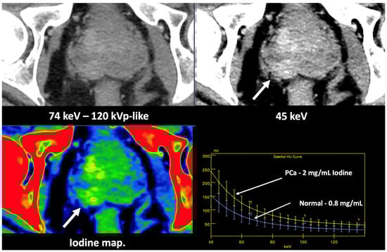 Figure 13. Prostate cancer (PCa) diagnosis. Incidental detection of a focal area of increased enhancement in the periphery of the prostate in contrast-enhanced CT may represent a clinically significant cancer (arrows) deserving of further workup. DECT imaging-based data such as a monoenergetic image at low energy values (e.g., 45 keV) and color-coded iodine map facilitate its detection. Note the difference between the spectral curve of the tumor (yellow curve, 1) and the normal parenchyma (blue curve, 2). Biopsy evidenced a prostate cancer having a Gleason score of 3 + 4. - LN characterization is challenging in oncologic imaging. Apart from morphologic criteria, different DECT parameters have been used, including iodine concentration, fat fraction, and similarity to the primary tumor [41,43]. Sauter et al. [44] evaluated standard values for of iodine concentration for healthy LNs in different anatomic areas that could be used to differentiate between healthy and pathological LNs. Recent studies have suggested lower iodine concentration in metastatic LNs compared to benign LNs [45]. However, the value of DECT imaging in differentiating malignant from non-malignant LNs seems to be limited and depends on the tumor type and technical features such as the protocols used for acquisition and contrast injection (Figure 14).